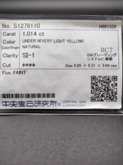 天然ダイヤモンドルース レクタンギュラーカット SI1 VERY LIGHT YELLOW 1.014ct チョイス宝石研究所ソーティング付き