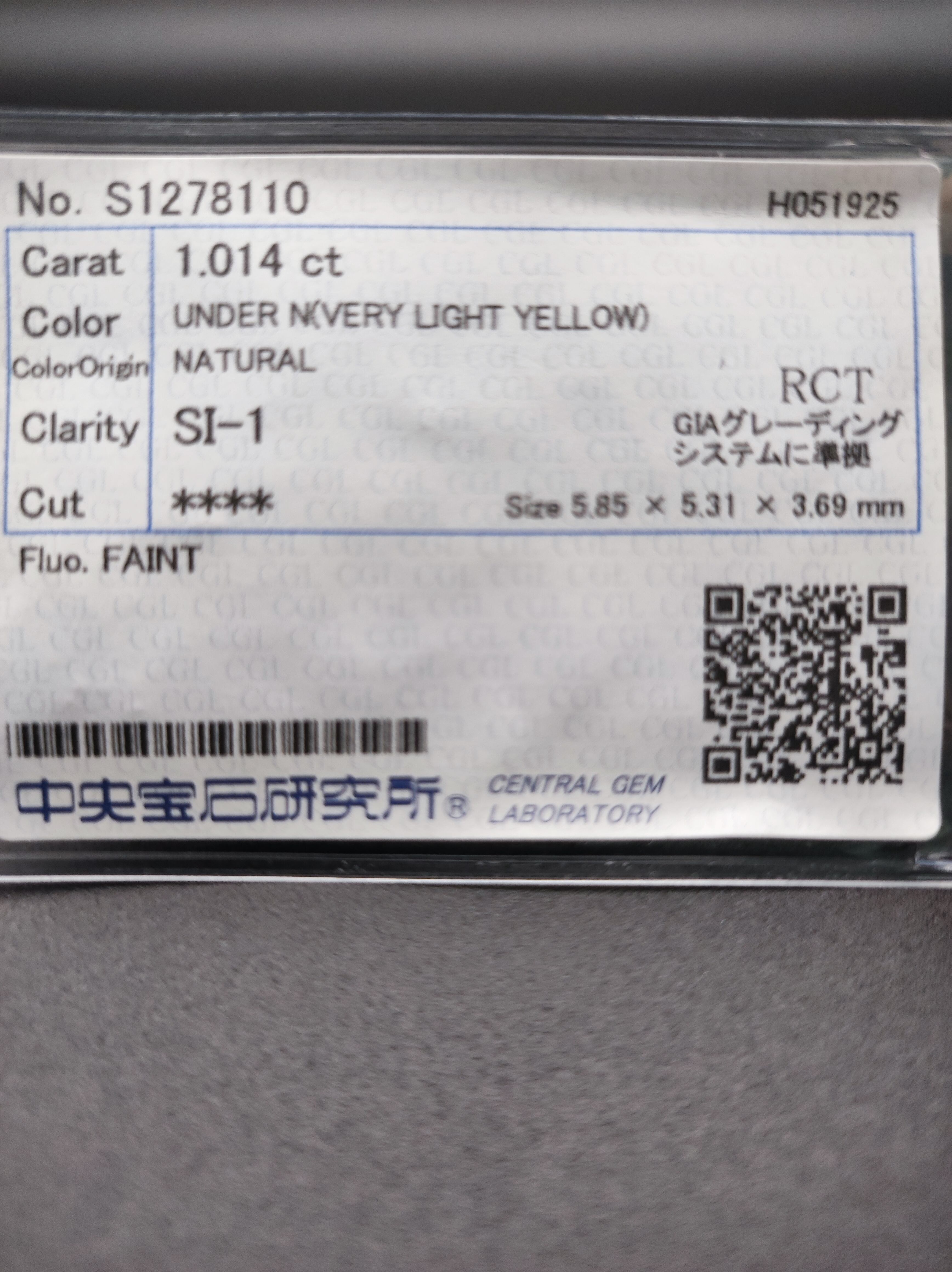 1.014ctの輝きは、非常に軽やかなイエロートーンを持ち、どんなジュエリーとも調和する美しさを誇ります。特別な日から日常の装いまで幅広くご活用いただける逸品です♡